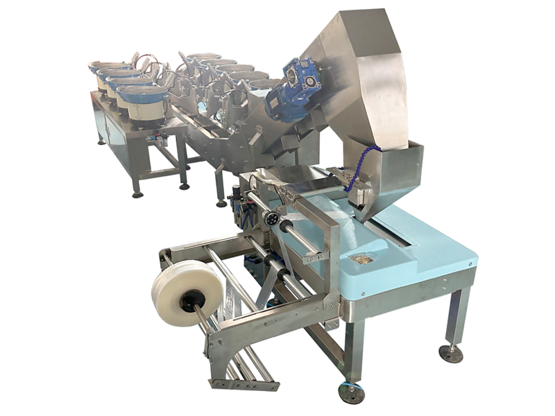 Sleeve film packing machine working with vibrate feeders, using fiber counting, capable of packing different kinds of fittings, like screws, bolts, nuts, hinges, sleeve, handles, bearings etc.